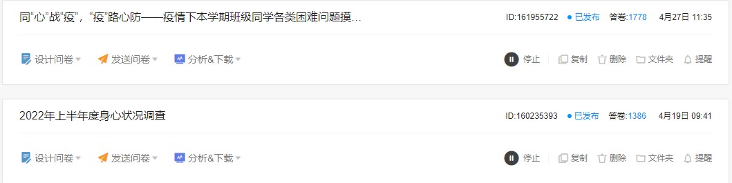 2022年4月初,我院积极开展“同心战“疫”,“疫”路心防”学生思想状况调查,旨在通过调查了解广大学生想什么、思什么、需什么,有什么样的困难和困惑,从而能全面了解学生在疫情防控期间的所思所想,准确把握学生的思想动态,为及时了解和掌握我院学生返校后的思想动态和学风状况以及心理情况,增强思想政治教育工作的针对性,发现和解决学生在思想、心理、学业、经济方面的问题,并基于此通过线上活动多种方式来更好的服务学生,促进学生健康发展和成长。