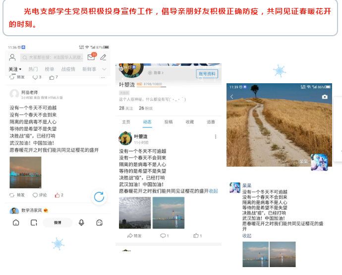 学生党员通过微信朋友圈、微博、支部QQ群等平台,分析疫情,正面引导;积极宣传,科学防疫;深情发文,传播正能量: